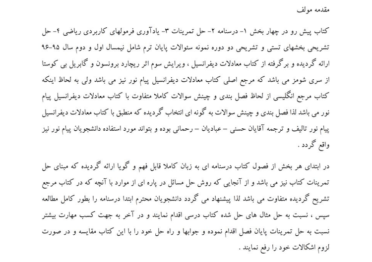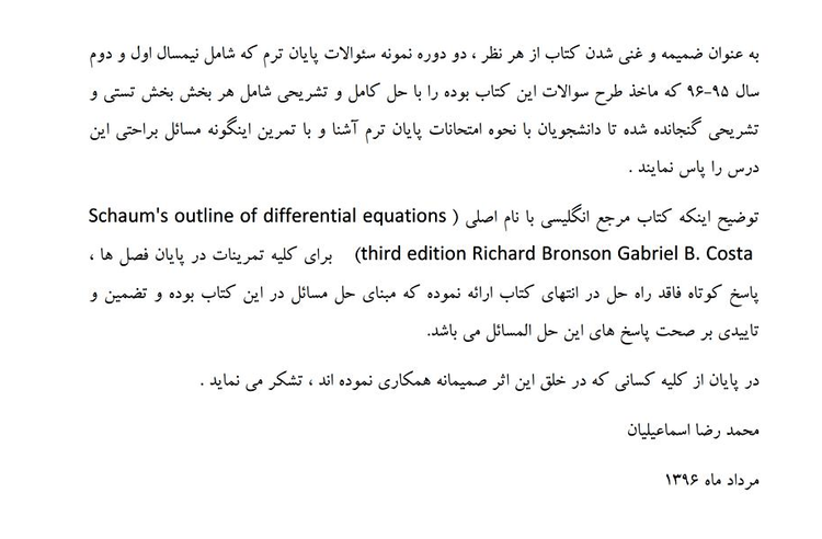 کتاب پیش رو در چهار بخش 1- درسنامه 2- حل تشریحی تمرینات 3- یاد آوری فرمولهای کاربردی ریاضی در حل تمرینات کتاب 4- حل تشریحی بخشهای تستی و تشریحی دو دوره نمونه سوالات پایان ترم شامل نیمسال اول و دوم سال 96-95 ارائه گردیده و برگرفته از کتاب معادلات دیفرانسیل , ویرایش سوم اثر ریچارد برونسون و گابریل بی کوستا از سری شومز می باشد که مرجع اصلی کتاب معادلات دیفرانسیل پیام نور می باشد ولی به لحاظ اینکه کتاب مرجع انگلیسی از لحاظ فصل بندی و چینش سوالات کاملا متفاوت با کتاب معادلات دیفرانسیل پیام نور می باشد لذا فصل بندی و چینش سوالات به گونه ای انتخاب گردیده که منطبق با کتاب معادلات دیفرانسیل تالیف و ترجمه آقایان حسنی عبادیان رحمانی بوده و بتواند مورد استفاده دانشجویان محترم پیام نور واقع گردد