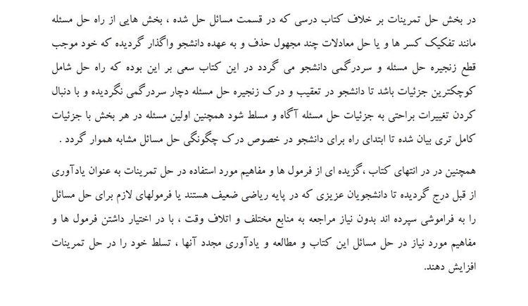 در ابتدای هر بخش از فصول کتاب ، درسنامه ای به زبان کاملا قابل فهم و گویا ارائه گردیده که مبنای حل تمرینات در این کتاب نیز می باشد و از آنجایی که روش حل مسائل در پاره ای از موارد با آنچه در کتاب مرجع تشریح گردیده ، متفاوت می باشد لذا یشنهاد می گردد دانشجویان محترم ابتدا درسنامه را بطور کامل مطالعه سپس نسبت به حل مثالهای حل شده کتاب درسی اقدام نموده و در آخر به جهت کسب مهارت بیشتر نسبت به حل تمرینات پایان فصل اقدام و جوابها بدست آمده را با این کتاب مقایسه و در صورت لزوم رفع اشکال نمایند .
